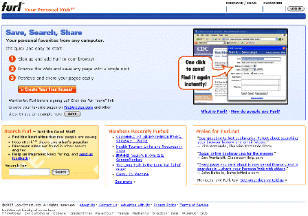 Furl is a social bookmarking site often compared to Deli.cio.us (TechCrunch review of delicious here). However, there are some key differences and many people use both obsessively.