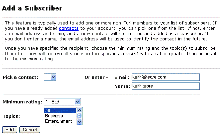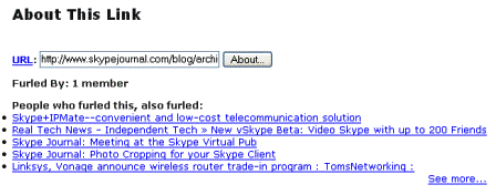 There are also other nice Furl options, like adding friends who can be notified of your new postings, and the Furl search engine is fantastic, almost as an afterthought. Another feature – if you view a furl’d URL, you can see other URLs that user’s Furl’d as well – a great way to find related content (see last screen shot below)