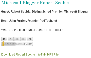 In their own words, “I’m putting up my podcasting site called PodTech.net – it’s a podcasting InfoTalk series dedicated to being a timeshifted radio program about Silicon Valley in the new syndicated world of timeshifted media. Some people say that Silicon Valley is losing its influence. My take is that Silicon Valley is just changing. My show is designed to produce Information about Silicon Valley via podcasting and blogs and push it to the world and then recycle a community back to Silicon Valley. Yes Silicon Valley is changing …but it’s increasing its’ influence because it’s now virtual and syndicated!”