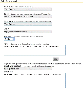 In general, we find Simpy’s user interface and search capabilities superior to del.icio.us and Furl. We like the interface for adding bookmarks, and ask only that pages can be bookmarked via a popup like del.icio.us (as an option). The optional additional metadata fields are really useful.