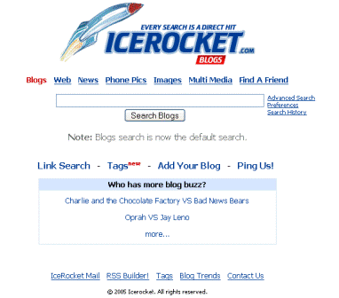IceRocket Tags: icerocket, blogscour, markcuban, feedster, technorati, blogpulse, bloglines, google, tagcloud, tags, tagging, search, blogsearch, web2.0