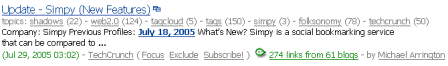 Basically, IceRocket is awesome. One area where they really shine is in search results. A result includes tons of useful links. In addition to a link to the source, there are also links to tags for the result, the blog itself, tools to refine the search to include or exclude that blog, number of links to the blog (for relevance and ego), and they even link to the RSS feed for the blog. All search results pages have RSS feeds.