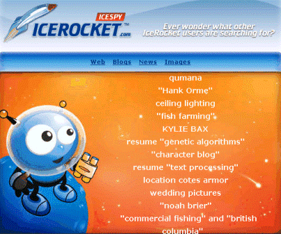 Another fun tool is IceSpy, which shows a rolling list of incoming search terms (all linked). This reminds me of the flat screen in Google’s offices that shows incoming searches (although Google appears to filter out adult terms while IceRocket happily does not :-) ).
