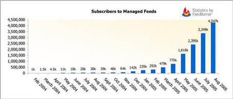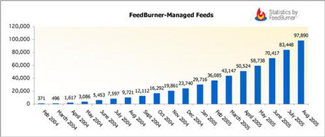 Feedburner now manages about 100,000 feeds and about 4.3 million people subscribe to those feeds. The growth rates are obvious: