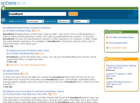 I met with Tony Conrad, one of the founders of Sphere, today at our office (ok, its a house, but it’s also an office – just ask the IRS). Sphere is a new blog search engine that quite frankly blows everything, and I mean everything, I’ve seen out of the water in terms of relevance (and, by the way, design…Adaptive Path was involved).