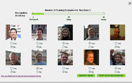 That’s when the fun starts. In my case about 400 pictures were uploaded. I was presented with a view of facial thumbnails of everyone in my photos. Riya asks that you begin to educate it by telling it who the people are…it then very quickly starts to auto-tag pictures with a surprising level of accuracy.