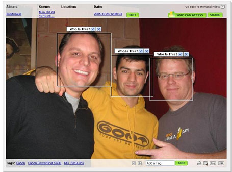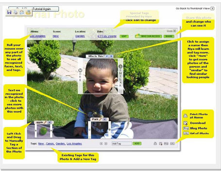 Riya leverages potent facial and text recognition technology with an intelligent interface to help people make sense of the thousands of untitled and untagged photos that are building up on their hard drives (and on the web).