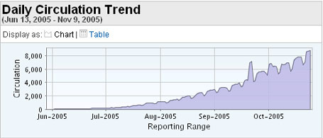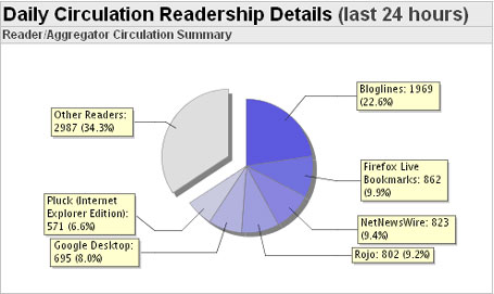 Readers have grown at a pretty steady rate. I think this is a reflection of general growth in the blogosphere, and the fact that I am writing about all of the interesting new companies that are popping up on the web. To really understand web 2.0, you have to look at the companies. That’s all I do here. We’ve grown to about 9,000 daily RSS readers. Page views swing wildly from day to day depending on what links are coming in. (from feedburner)
