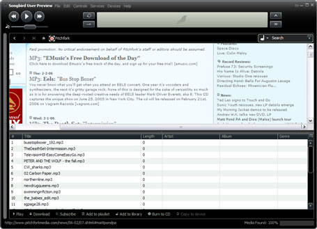 Songbird plays the Web. Songbird may view Web pages as playlists of MP3s. Soon, Web page authors may publish playlists and transfer MP3s into Songbird in support of digital music stores like eMusic, music subscription services like Yahoo! Music Unlimited, virtual jamming services like Ninjam, playlist sharing services like WebJay and more