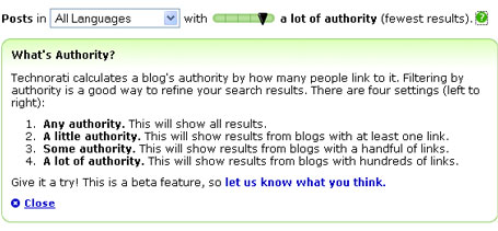 Robert Scoble points out that Technorati has taken a shot at the problem, though. They’ve quietly released an “authority” slider to allow results to be filtered. See results anywhere from all blogs, to just blogs with hundreds of links. They assign authority to a post based on how many links a blog has. The image below shows the slider at the top and the text within the imagedescribes how it works.