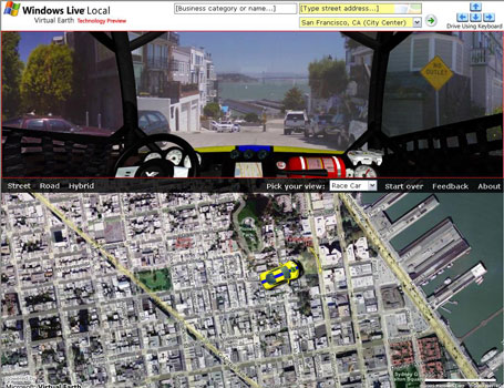 Microsoft’s Live.com is launching a preview version of a new service called Street-Side today (link will be live around 12 PST today). Street-Side will augment the Live Local service and give street level views of the entire city. Searches can be made by address or business name, and you can “drive” around the city using the arrow keys. See the screen shot below for a visual.