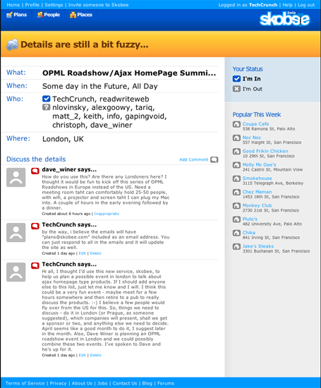 Skobee will then send out emails to each person along with the current event information, and they can register for the site if they are a new user (viral business model – yes). Here’s where things get interesting: those people can add new participants, and suggest changes to the date or place by leaving a comment with natural language, such as “How about Tuesday instead, and we’ll meet at TechCrunch”. Skobee will structure the data and update the event information for everyone. And even better: instead of logging into the site and leaving a comment, participants can simple “reply all” to the email, which includes “plans@skobee.com”, and skobee will figure out what event is being discussed, add a comment to the event page automatically, and update accordingly.