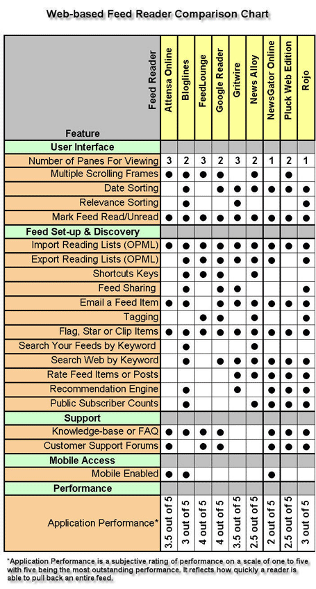 There are a number of different types of readers: web-based, desktop, Outlook based, etc… This post is focused solely on web-based feed readers. I’ve included the big guys plus some up and coming readers with outstanding features and/or performance like News Alloy, Gritwire, Attensa and FeedLounge.