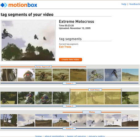 Like YouTube and other services, Motionbox allows tagging of video files. But they also allow deep tagging of parts of video files. Open a file (see screenshot above) select a portion of the video, and tag it. Viewers later will be able to skip right to that clip of the video by clicking on the tag. Longer videos can now easily be broken down into linkable pieces. This is a huge leap forward over competiting services.