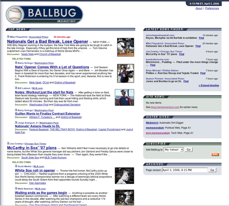 Tracking Major League Baseball coverage this year will be a little bit easier than before – Gabe Rivera is launching a Memeorandum site called BallBug today. BallBug offers a news summary, updated every five minutes, spotlighting the most buzzed about baseball stories and blog posts on the web. It’s like tech.memeorandum, but for baseball.