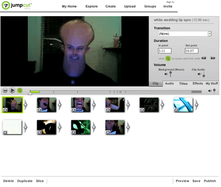 Jumpcut, as the newest entrant, has some really spectacular features, that should encourage video mashing between users. It’s editing features, also using Flash, are better than what I saw with Motionbox. Any video can be cloned (unless restricted by the publisher), and other clips can be added to the cloned video. Sound files can be added to either overwrite existing audio or mix in with it. They also allow a number of “transition” features as effects. Overall, its pretty cool. Check it out by clicking “remix” on this video screen.