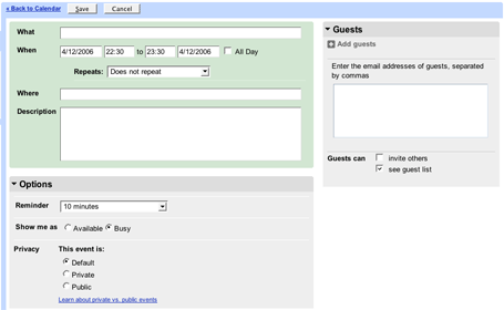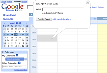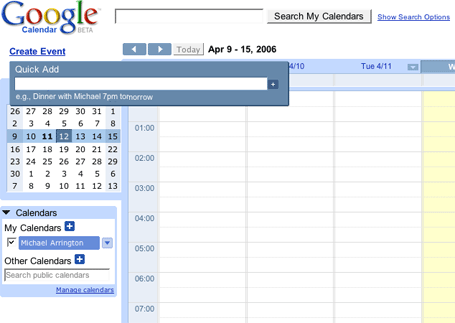 My first impression – It’s fast, slick and stable. Calendar is Ajax driven and, as I mentioned, very fast. Adding an event is as easy as typing “Dinner with Keith tomorrow at 8pm” and Calendar structures the data properly and places a correct calendar entry. This entry can be dragged around the screen to a new day or time.