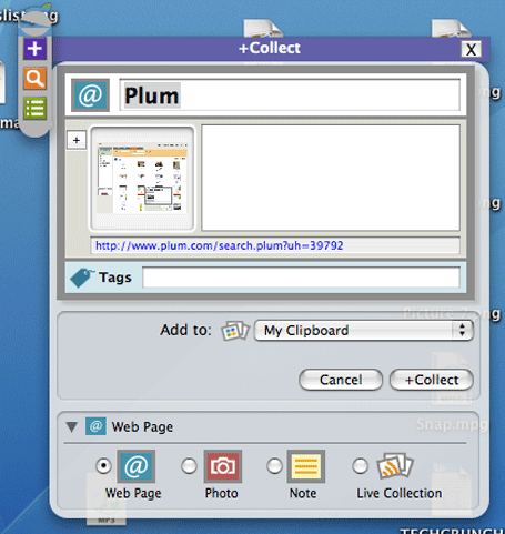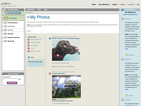 One key way that Plum is different than other bookmarking site is that it allows users to bookmark items on their computer, not just on the web. A file that is open in certain desktop applications (things like photos, power point presentations, iTunes playlists, address book entries, email, etc) can be added to Plum by clicking a button on the Plummer, a small downloadable application for Windows or Mac. See the last screen shot below for a look at the Plummer.