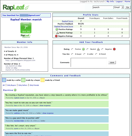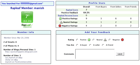 Enter Rapleaf, a new San Francisco-based service created by Auren Hoffman and Manish Shah that is a fully open version of eBay’s feedback system. It’s in private beta, but will be launching to the public on May 7, 2006.