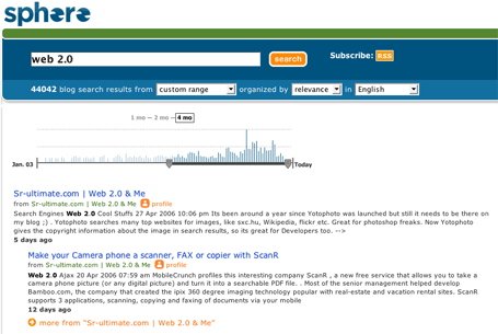 Sphere search results can be viewed by date, relevance or a combination of both. Unlike Technorati, which determines a blog’s relevance based on the total number of unique links into that blog, Sphere is taking an algorithmic approach. For Sphere, “relevance” is based on three key factors: links in/out of blog; meta data around the blog (average length of posts, post frequency, etc; and a semantic analysis of the posts themselves). In our tests Sphere blog relevance is very good. We’ll do a more in depth review and comparison at a later date.