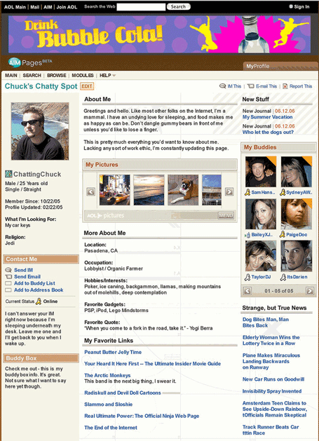 AIM Pages: AOL wants to be the 24/7 home base for as many users as possible hence the AIM Page, a social networking site/home page/home base that stays active even when the buddy list is offline. Kerry Parkins, director, key audiences product marketing, calls it “a very natural extension” for AIM”s existing social network. Instead of people joining a created community a la Classic AOL, they have their own with the buddy list they already use at the core.