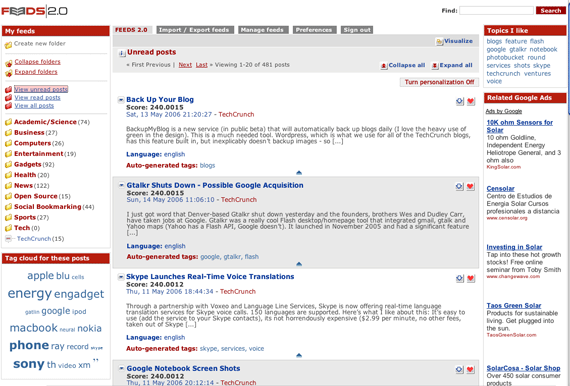 The personalization features alone will be enough to convert some users, but I like Feeds 2.0 for other reasons, too. You can view content on a feed by feed (bloglines) basis, or via a river of news view which ranks all content in reverse chronological order (and by personalization if you have that turned on). They auto-generate descriptive tags for each post, helping you find content via a tag cloud for all unread posts. I’d like to see them add the ability for users to social-tag content as well. But the basic result of the tagging/tag cloud feature, along with personalization, is the ability to quickly find interesting content in a sea of new posts.