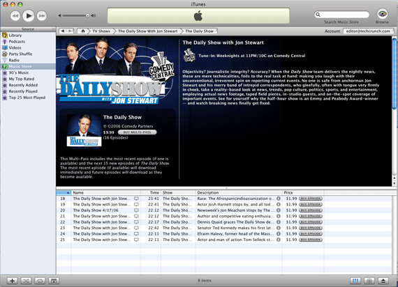 By January 2006, iTunes offered over 40 television shows for download, including, most recently, additions from Nickelodeon, Comedy Central and MTV with episodes of such shows as the Daily Show, Spongebob Squarepants, South Park, and Punk’d. Showtime added some content in February.