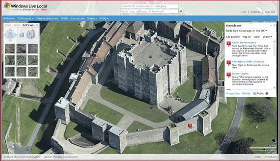Live Local’s Bird’s Eye View, which provides multi-angled photographs from low flying aircraft, has now expanded to include large parts of the UK. While central London is not yet available, Steve did send me a screen shot, below, showing Dover Castle (a screen shot showing a different angle is here). The rest of the UK is being added shortly, and the Live Local team will be adding new cities and countries over time.
