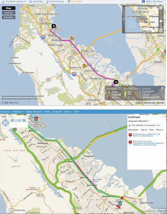 The best way to understand the difference is to see it visually. The Yahoo and Live Local maps below show the same journey, from my house to San Francisco airport. Yahoo is on top and shows reported incidents with an exclamation point. Microsoft, bottom, also shows incidents, but uses a color coded scheme (green = good flow, red = traffic) to show traffic flow throughout the journey, on both sides of the highway. For an additional screenshot, see this image that shows traffic on one side of a bridge, but not the other, along with a link to a local traffic camera (set as a pushpin).