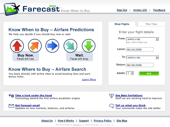 Seattle-based Farecast, now in private beta, is an airfare pricing comparision tool that also uses a predictive algorithm to recommend when you buy your ticket. So the idea is to show the user not just who has the cheapest ticket, but whether or not waiting might make sense as well. Look for Minneapolis-based Flyspy to launch a similar service in the near future.