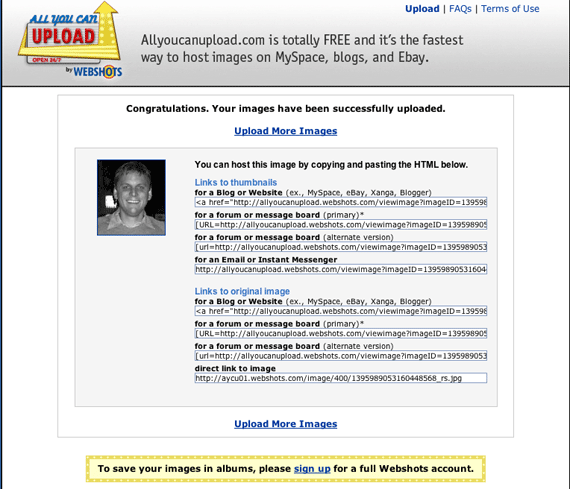 AllYouCanUpload is a site that makes uploading photos as easy as it can possibly get. They’ve removed all of the friction. You do not need to register for an account. You just use the uploading tool and you are shown the image along with codes to post the photo on sites like Myspace, ebay and others (I’d also like an option to have the image links emailed to me). Unlike Photobucket and Imageshack, AllYouCanUpload is completely free, and no advertisements appear on the uploading areas of the site (there are ads on the hosted part of the site, which you see if you click on a hosted image). There is no limit to the number of photos that can be uploaded or the total amount of storage that may be consumed. There is no limit on the size of an image, and images are not resized unless you request it. And possibly most importantly, there are absolutely no bandwidth restraints.