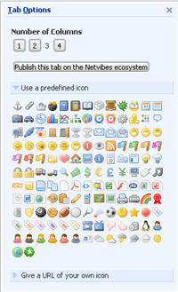 But the key innovation is elsewhere. NetVibes launched Ecosytem (accessible at eco.netvibes.com) which is a directory of contents and services for NetVibes that is managed by its users. It will enable anyone to easily create, share and rate any feed, plug-in or even tabs. You can directly add any item you wish within your NetVibes homepage directly from the directory just by clicking the “+” button. The directory can be browsed by item, tags and a search engine is also available. For example you can add a “web2.0” tab or a “world cup” tab to your homepage that include a good selection of feeds. And you can also populate the directory directly from your homepage by clicking the “publish to ecosystem” button present either on the left of the “refresh” feature on the top right of each “feed block” or within the menu of each tab (check screenshot on the side). You will then land to an editing page to give some detail on the item you wish to share (see screenshot below). Sharing is only public for now and i think it could be also great to have private sharing with your friends.
