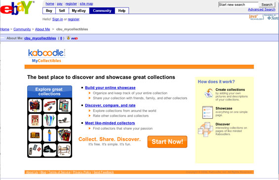 eBay users who purchase and sell items in the collectibles category will be able to showcase products they’ve purchased on ebay or elsewhere, tag them and allow comments (all standard Kaboodle functionality). The site already allows users to auto-import items they’ve purchased on eBay. in the future they’ll be able to list items within MyCollectibles for sale on eBay with a couple of clicks.
