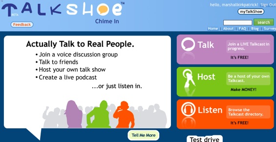Here’s how TalkShoe works. A Windows desktop client allows up to 25 people to participate in a conversation and chat behind the scenes. Calls are automatically recorded and entered into the site’s podcast directory. Show hosts receive money from the site’s ad revenues according to the number of their show’s listeners and for referring others to the service.