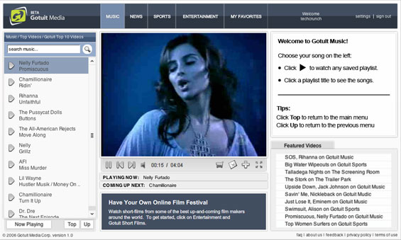 The site is Flash based and will have a familiar interface for YouTube users. This isn’t about long tail user generated content, though. Gotuit has struck licensing deals with labels and other content owners to show a deep library of premium content.