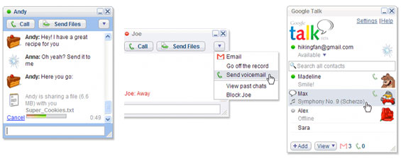 Voicemails can now be left for friends who do not answer calls through Google Talk. Unlike File Transfers above, this feature does not require that the friend use the Google Talk client. In that case, they’ll receive an email with the message attached as an audio file. Voicemails can be up to 10 minutes long, and messages can be left for people online without calling them directly by clicking the down arrrow from any profile card or chat window. Voicemail will also automatically kick in after 4 rings. See middle image below.