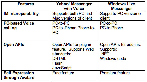 Yahoo Messenger is the second largest IM network after MSN, and even though Yahoo and MSN have announced interoperability (and continue to expand the beta group testing it), there’s still clearly a level of competitiveness between the two teams. Yahoo sent me the chart below comparing the two services.