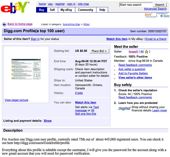 With all of the recent news about top Digg users being offered cash by Netscape to move over to their competing platform, I’m not surprised to see that someone has apparently placed their top 100 Digg profile up for sale on eBay.