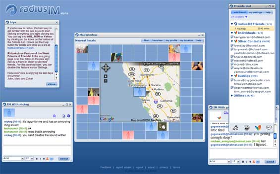 New York based RadiusIM is a just launched web based Ajax chat service. Like Meebo, RadiusIM allows users to log in with Yahoo, AIM, Microsoft or GTalk credentials. They also have their own direct IM service, which auto-determines your location and places an icon on a Google map embedded in the site.