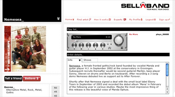 One week since signing on, most of the 130 bands on the site have raised between $200 and $500. One Goth band from the Netherlands has raised $4500. Sellaband says that the $50,000 goal is what’s needed to provide the kind of quality equipment and support that a major record label could provide. The company takes none of this money, only 30% of the site’s ad revenue. The company is made up of people who used to work at major labels and you’ve got to admire what they are doing. You’ve probably also got to give them some credit when they say that they can produce a better album with $50,000 than you or I could, they may well be right.