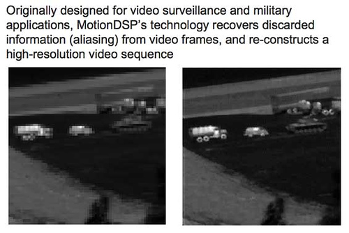 Motion DSP is creating a simple web based interface that will significantly enhance low resolution camera phone video into surprisingly high quality stuff. It started off in 1998 as a U.S. military funded project at UC Santa Cruz. In January 2005, Professor Peyman Milanfar, the primary researcher behind the technology, co-founded Motion DSP.