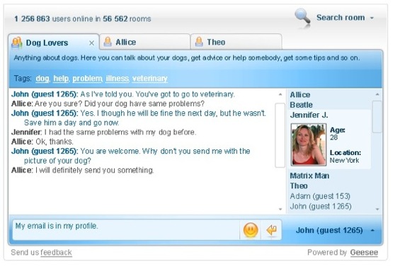 Here’s how it will be used: If I’m reading a blog about caring for German Shepherds or selecting a school for a child or deciding whether to buy Sea Monkeys from the back of a comic book – that blog could have a Geesee widget installed that would let me do a number of things. I could use it to chat with other people visiting the same site and the same time, I could use it to chat with people on other sites in rooms that have been tagged with the same terms as mine or I can search by tag and chat with people in any other room via any other participating page.