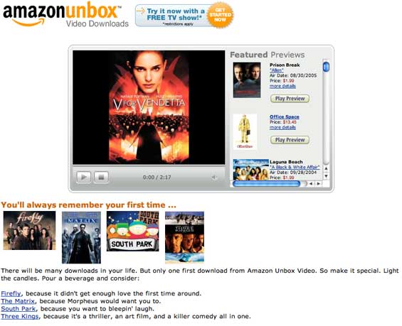 Amazon’s movie download site, called Unbox, appears to have gone live today. There’s no link yet on the front page of Amazon, but the direct link at unbox.com works. We covered early previews of the site last month. Shows may be purchased or rented. For purchases, TV episodes are $1.99, most movies are between $8 and $15, some are $20. Spike Lee’s Do the Right Thing is $36. (Update – that’s been changed to $16.) Rentals are $1.99 or $2.99.