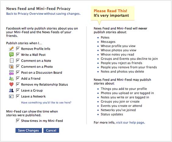 So we have been coding nonstop for two days to get you better privacy controls. This new privacy page will allow you to choose which types of stories go into your Mini-Feed and your friends’ News Feeds, and it also lists the type of actions Facebook will never let any other person know about.