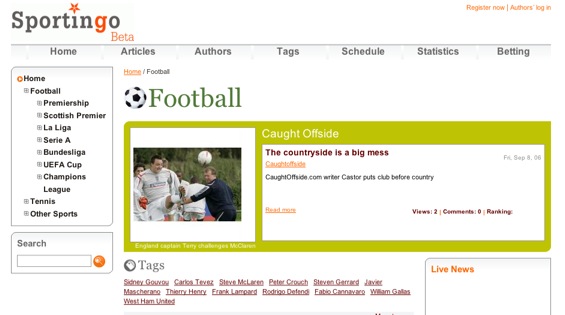 Initially focused on European football and tennis, Sportingo offers users a comprehensive content management system to upload their original writing that then gets edited by a team of Sportingo editors. The company’s editors write headlines, fix grammar, approve tags for consistency, apply search engine optimizing metadata to each article, attach relevant statistics and photos licensed from outside vendors and determine placement of the stories on the Sportingo site. Editors can use easy forms to add, remove and place elements from templates in each story. Reader interaction with each story will also impact the placement of stories. Betting odds on matches and sports news are displayed because people find them interesting, no betting goes on via Sportingo. The revenue model is entirely based on advertisements.