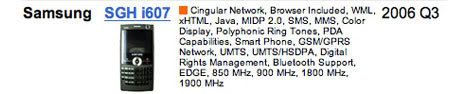 It looks like I might have found my next phone. Cingular will be offering the Samsung SGH i607 in Q3. This UMTS/HSDPA equipped handset runs Windows Mobile 5 OS and it is said to be particularly capable of handling xCSS and enhanced-xHTML. It also features a standard 1.3MP camera, Bluetooth connectivity and a 64k TFT display with a resolution of 320 x 240. In addition to all of that, it supports AMR, MIDI, MP3, AAC, AAC+, MPEG4, H.263 and Real formats. No word on pricing, but it should be available soon.