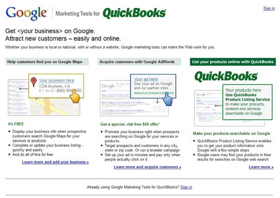 Google and Intuit are announcing a partnership today at 1:15 pm California time. The meat of it seems to be that they are building Google services directly into Intuit’s QuickBooks, so small business users will be able to list themselves on Google Maps, create and manage advertising campaign with Adwords and post listings on Google Base.