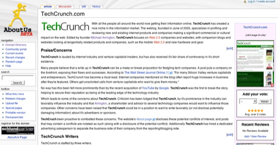 There is something that bothers me about having 3 million pages about websites, populated automatically and by any random editor who stops by, titled “AboutUs.” The phrase implies an autobiographical text. (It’s also probably very good for SEO.) The AboutUs page on TechCrunch wasn’t written by anyone associated with TechCrunch and there’s something about the name AboutUs that makes me uncomfortable about that. I could certainly go in and change the entry, but it feels more like something I’m obligated to do unless I ignore it.