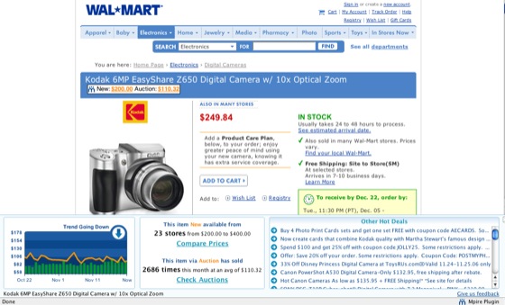 We’ve been getting “just in time for the holidays” pitches for coverage from quite a few shopping sites lately but Seattle based number crunchers Mpire have come out with one of the best new shopping products I’ve seen yet. The company’s site launched in June of this year. It compares prices on items for sale at a list of online retailers and tracks eBay auction prices for items over time. The graph acts (and looks) like Farecast airfare predictions, but for past auction price trends.