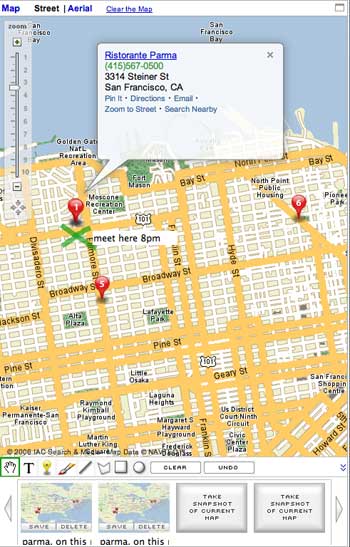A Users can also pin items (events, places) onto a map, draw their own notes on the map, and send a permalink to the customized map to friends for printing or for their comments.